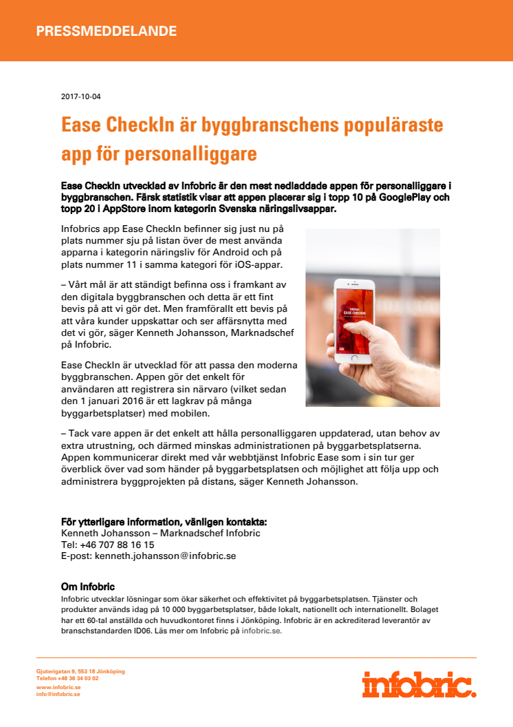 Ease CheckIn utvecklad av Infobric är den mest nedladdade appen för personalliggare i byggbranschen. Färsk statistik visar att appen placerar sig i topp 10 på GooglePlay och topp 20 i AppStore inom kategorin Svenska näringslivsappar.