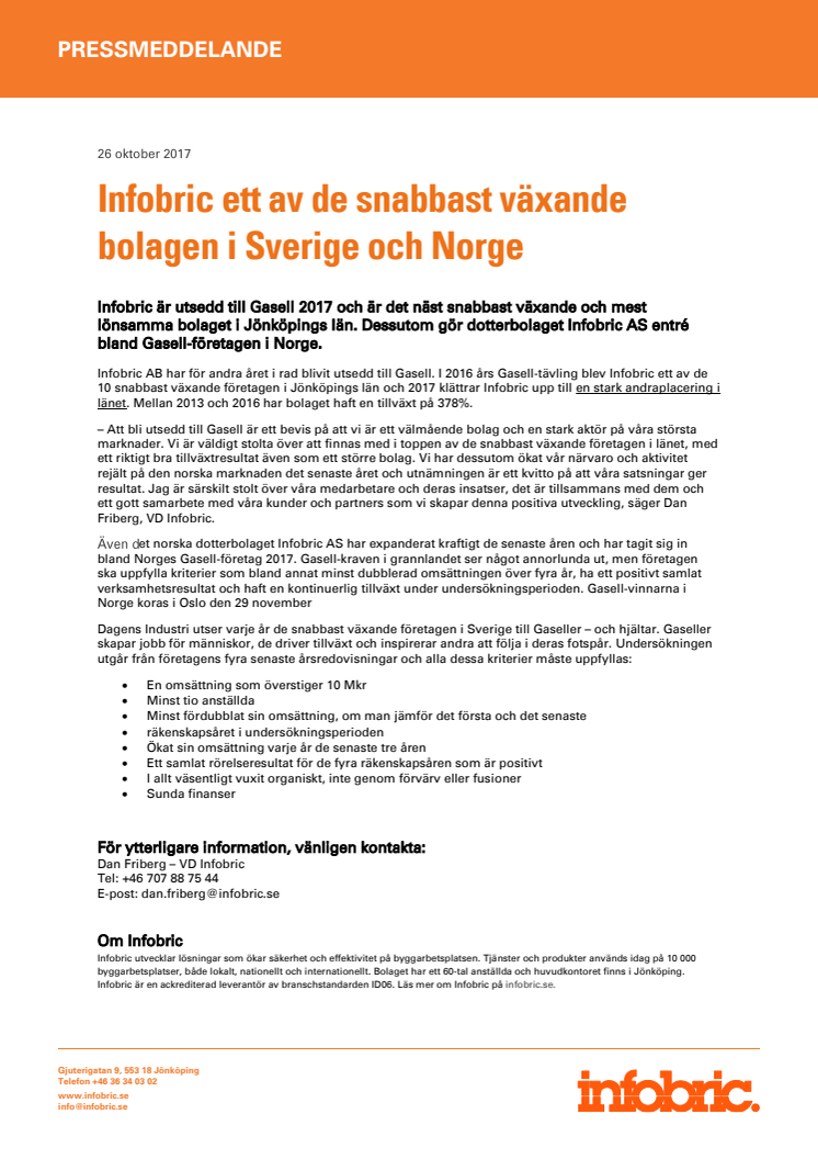 Även det norska dotterbolaget Infobric AS har expanderat kraftigt de senaste åren och har tagit sig in bland Norges Gasell-företag 2017. Gasell-kraven i grannlandet ser något annorlunda ut, men företagen ska uppfylla kriterier som bland annat minst dubblerad omsättningen över fyra år, ha ett positivt samlat verksamhetsresultat och haft en kontinuerlig tillväxt under undersökningsperioden. Gasell-vinnarna i Norge koras i Oslo den 29 november.