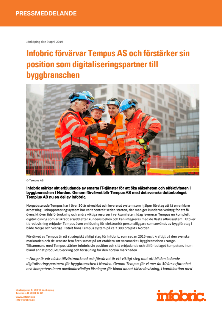 – Norge är vår nästa tillväxtmarknad och förvärvet är ett viktigt steg mot att bli den ledande digitaliseringspartnern för byggbranschen i Norden. Genom Tempus får vi mer än 30 års erfarenhet och kompetens inom användarvänliga lösningar för bland annat tidsredovisning, i kombination med att vi stärker vårt erbjudande för att hjälpa våra kunder att öka säkerheten och effektiviteten i sina byggprojekt, säger Dan Friberg, VD för Infobric AB.