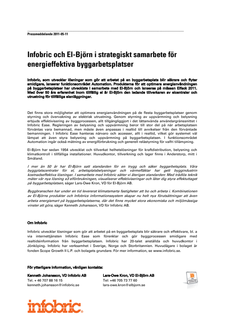 Byggbranschen har under en tid levererat klimatsmarta fastigheter att bo och arbeta i. Kombinationen av El-Björns produkter och Infobrics informationssystem skapar nu helt nya förutsättningar att även arbeta energismart på byggarbetsplatserna, där det finns mycket stora ekonomiska och miljömässiga vinster att göra, säger Kenneth Johansson, VD för Infobric AB.