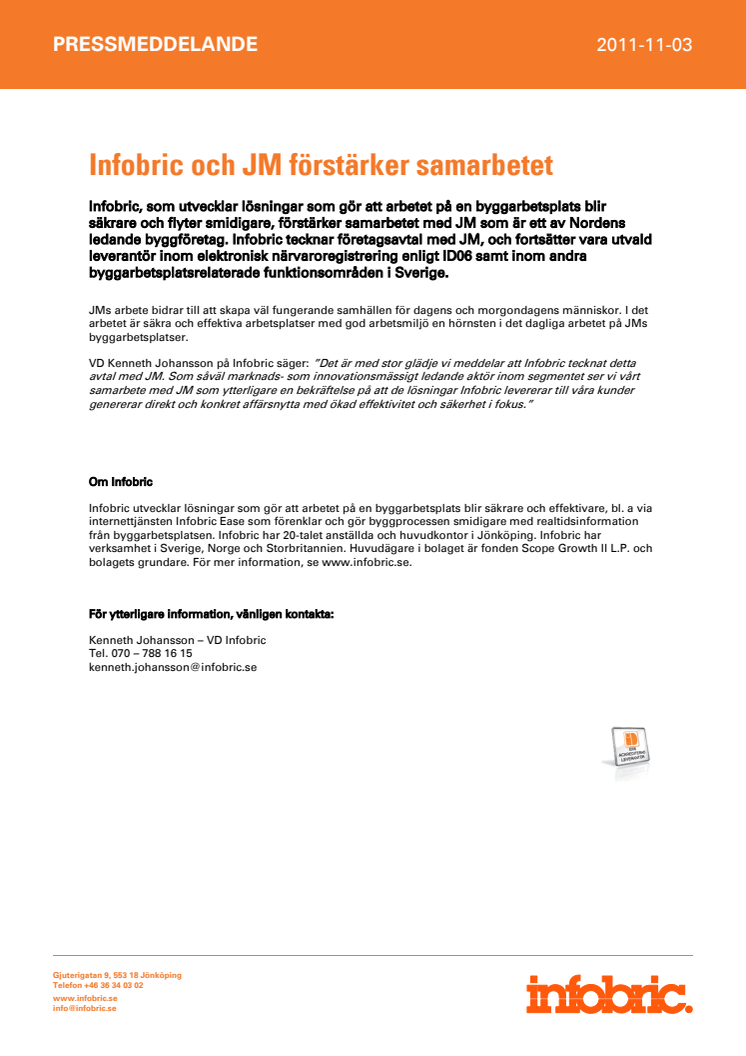 VD Kenneth Johansson på Infobric säger: ”Det är med stor glädje vi meddelar att Infobric tecknat detta avtal med JM. Som såväl marknads- som innovationsmässigt ledande aktör inom segmentet ser vi vårt samarbete med JM som ytterligare en bekräftelse på att de lösningar Infobric levererar till våra kunder genererar direkt och konkret affärsnytta med ökad effektivitet och säkerhet i fokus”.