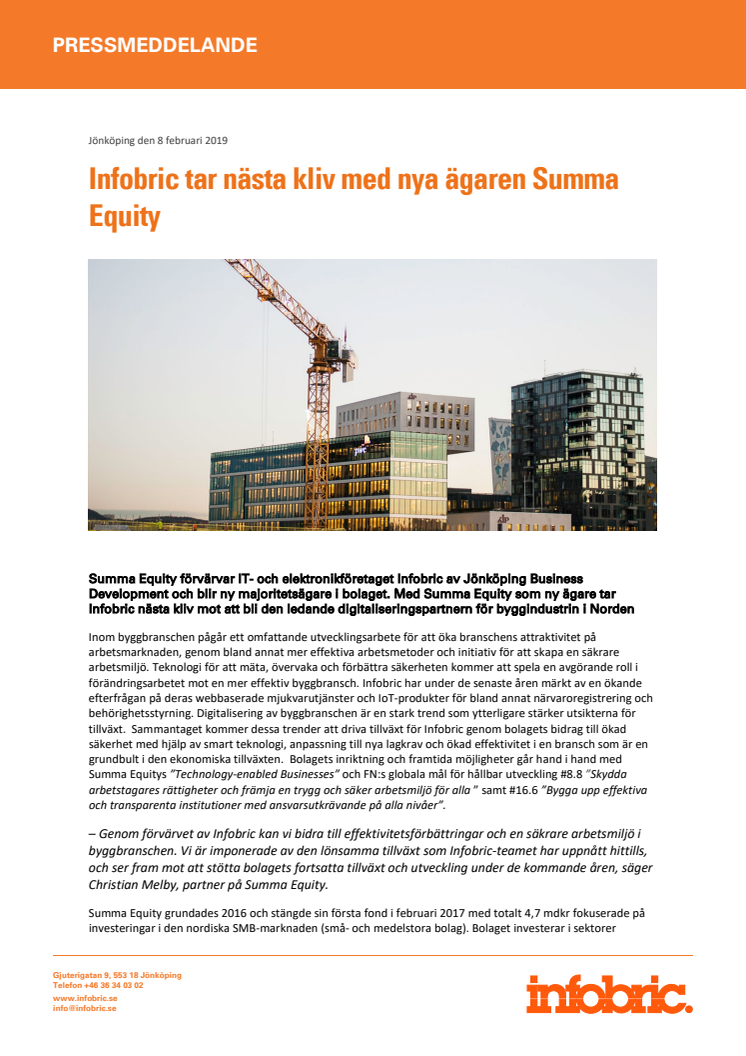 – Genom förvärvet av Infobric kan vi bidra till effektivitetsförbättringar och en säkrare arbetsmiljö i byggbranschen. Vi är imponerade av den lönsamma tillväxt som Infobric-teamet har uppnått hittills, och ser fram mot att stötta bolagets fortsatta tillväxt och utveckling under de kommande åren, säger Christian Melby, partner på Summa Equity.