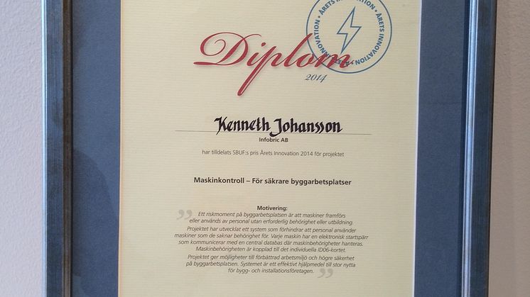Till Årets Innovation 2014 utsåg SBUF utvecklingsprojektet Maskinkontroll - För säkrare byggarbetsplatser. Bland de omkring hundra SBUF-finansierade utvecklingsprojekt slutförda under året var det detta projekt som bäst uppfyllde kriterierna för utmärkelsen.